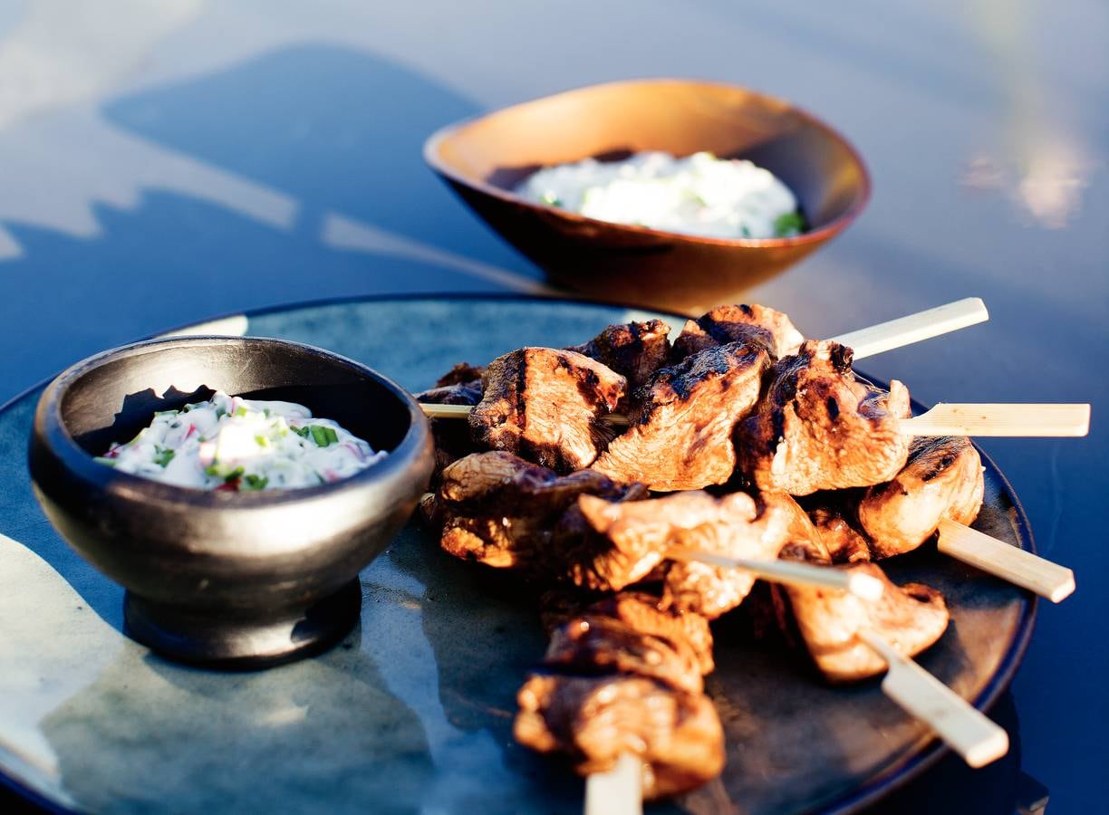 Doe de blokjes kipfilet in een kom en meng met het azijn, de olie en peper en zout. Laat 30 min. marineren. Rijg de kip aan satéprikkers. Meng de citroenmayonaise met de rode peper en de bieslook. Verhit een grillpan en gril de kipspiesjes in 6 min. bruin en gaar. Serveer met de kruidenmayo.