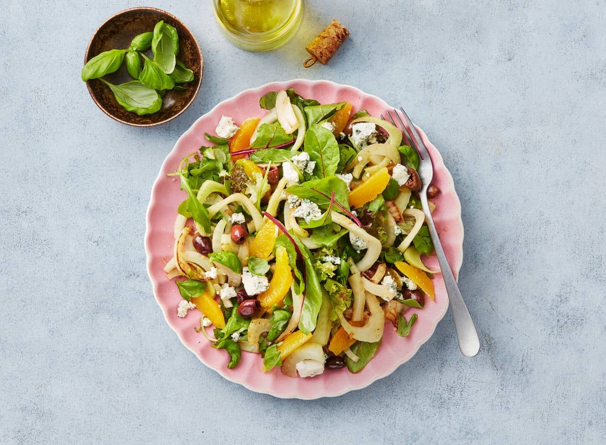 Pers de laatste sinaasappel uit. Snijd de kaas in blokjes en voeg met de slamelange toe aan de venkelknollen. Scheur de basilicumblaadjes in stukken en strooi met de olijven over de salade. Schep voorzichtig om en besprenkel met het sinaasappelsap en de olijfolie extra vierge.