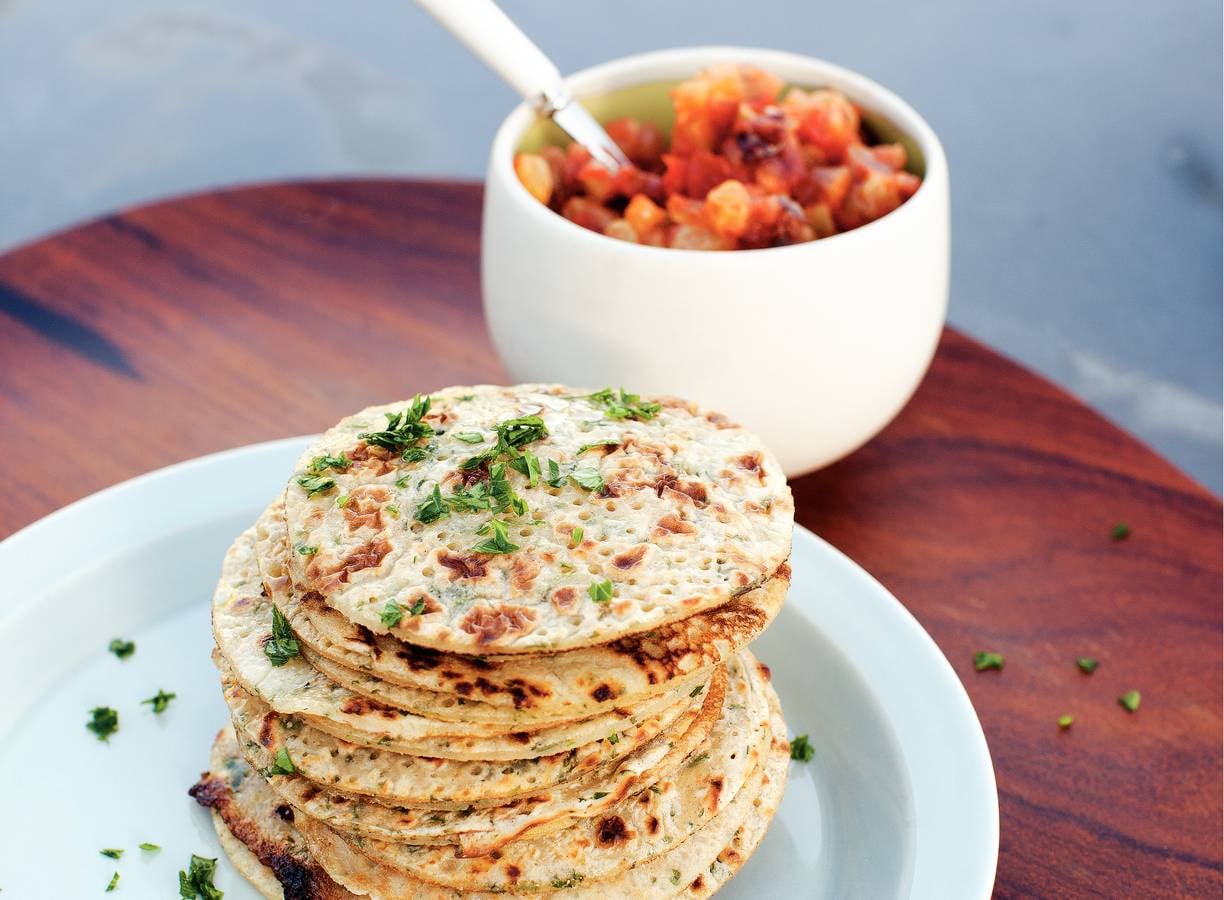 Snijd de kruiden fijn. Bereid de pannenkoekmix volgens de aanwijzingen op de verpakking. Voeg de kruiden en peper en zout toe en roer door.