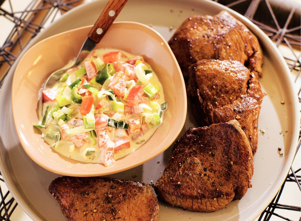Fruit ondertussen de ui 2 min. in dezelfde pan. Snijd de prei in halve ringen. Voeg met de paprika toe aan de ui en bak 2 min. mee. Schuif de groente naar de zijkant en schenk de wodka in de pan. Laat op hoog vuur 1 min. koken om de alcohol te verdampen. Pas op: de damp kan vlam vatten, dus houd afstand en zet de afzuigkap van tevoren even uit. Voeg de room toe. Schep om en serveer de saus bij de biefstuk.