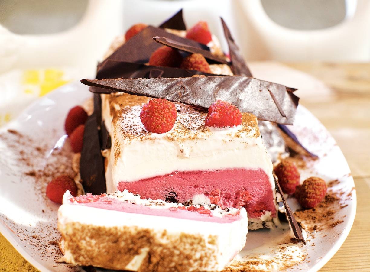Klop de slagroom met de suiker stijf. Houd de onderkant van de cakevorm kort onder de hete kraan en stort de ijsschnitt op een bord. Bestrijk met slagroom en versier met cacao, frambozen en de in stukken gebroken chocolade.