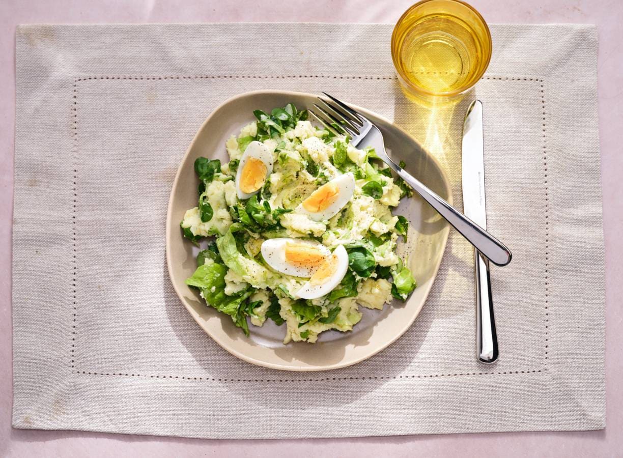 Schil de aardappelen. Kook ze in water met zout in 20 min. gaar. Kook de eieren in 8 min. hard.