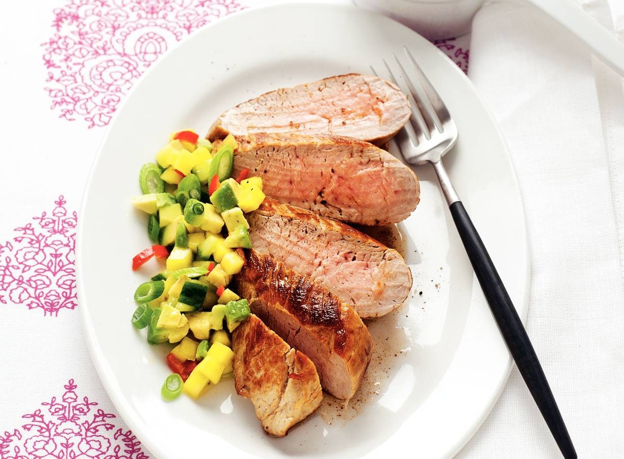 Vouw het dunnere uiteinde van de varkenshaas om zodat het vlees overal even dik is. Maak vast met de cocktailprikkers. Bestrooi met peper en zout. Verhit 2 el olie en de boter in een koekenpan en bak de varkenshaas in 10 min. rondom gaar. Neem uit de pan en laat 5 min. afgedekt rusten. Snijd het vlees in plakken van 1 1/2 cm. Serveer met de avocadosalsa. Lekker met gebakken aardappelschijfjes en rucolasalade.