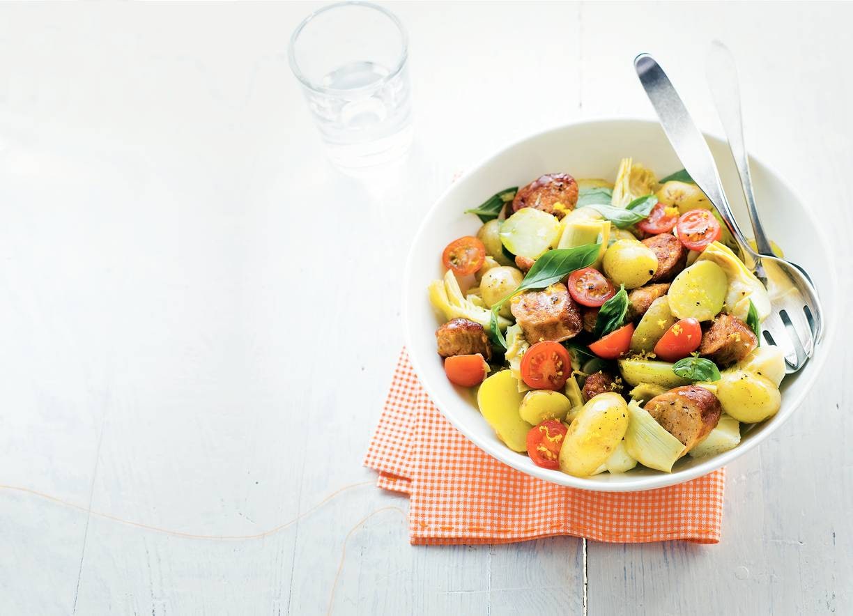Snijd de artisjokharten in kwarten en voeg samen met de tomaten en het basilicum toe aan de krieltjes.