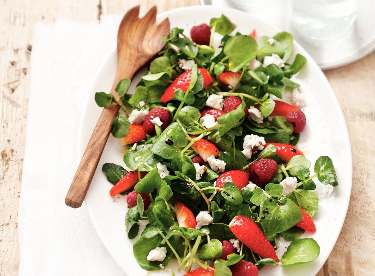 Verwijder de kroontjes van de aardbeien en snijd ze in de lengte in vieren. Doe de waterkers in een schaal en schep de aardbeien en frambozen erdoor.
