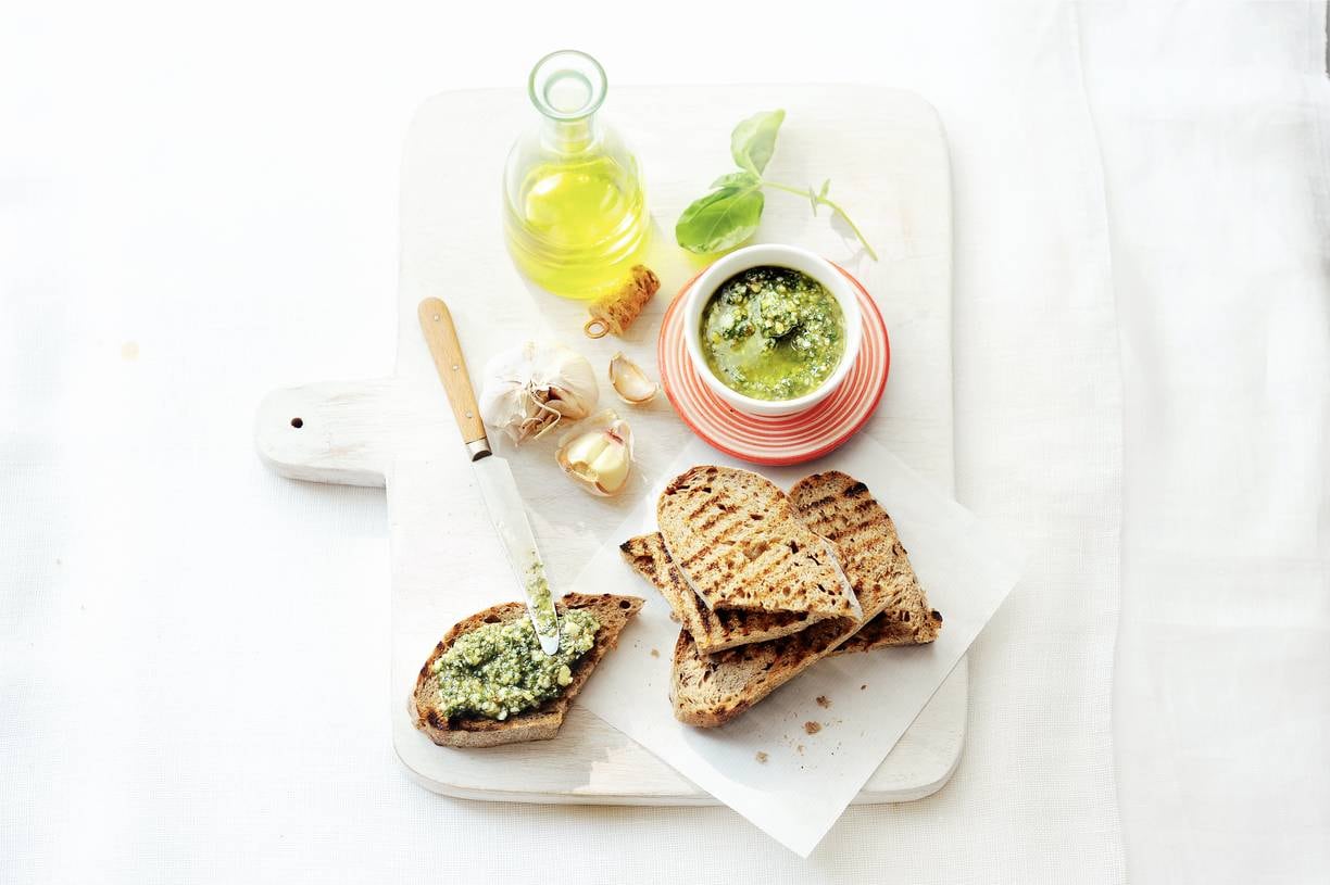 Verhit de grillpan en gril het brood 6 min., keer halverwege. Halveer de knoflook en wrijf 1 kant van het brood ermee in, besprenkel met de olie.