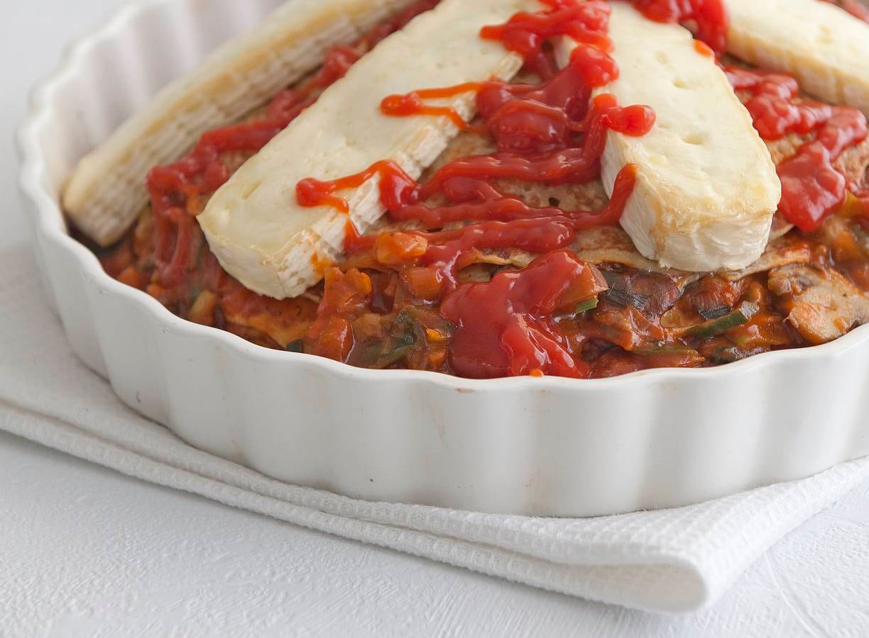Leg een pannenkoek in de quichevorm. Schep een flinke lepel groentesaus in het midden van de pannenkoek, zodat er een berg ontstaat. Leg hier weer een pannenkoek op en schep daar weer een lepel groentesaus op. Ga zo door tot de saus en pannenkoeken op zijn en eindig met een pannenkoek.