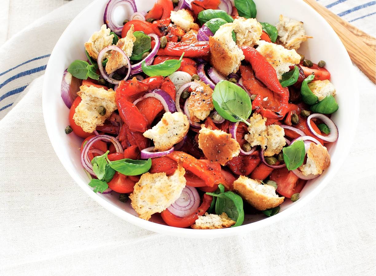 Scheur het brood in stukken en doe in de ovenschaal. Meng 2 el olie met de knoflook en zout naar smaak. Besprenkel het brood hiermee en bak ca. 15 min. in de oven. Schep halverwege om. Laat uit de oven 5 min. afkoelen. Meng het basilicum door de salade. Serveer direct.