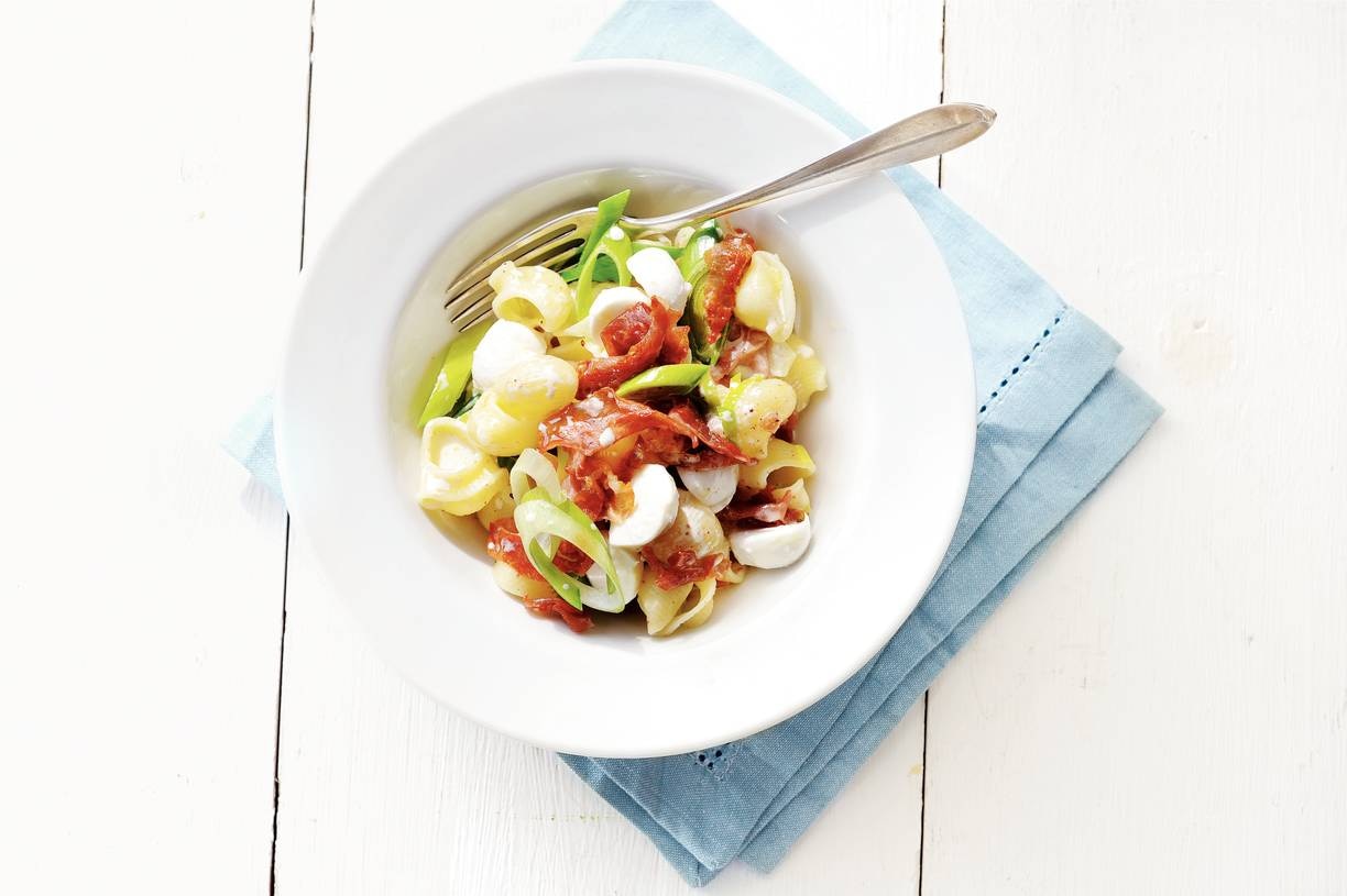 Kook ondertussen de pasta volgens de aanwijzingen op de verpakking beetgaar. Voeg de room, nootmuskaat, peper en zout toe aan de prei en warm nog 2 min. door. Schep de pasta en de ongebakken ham erdoor. Halveer de mozzarella en verdeel de pasta over borden. Leg de mozzarella en de gebakken ham erop.