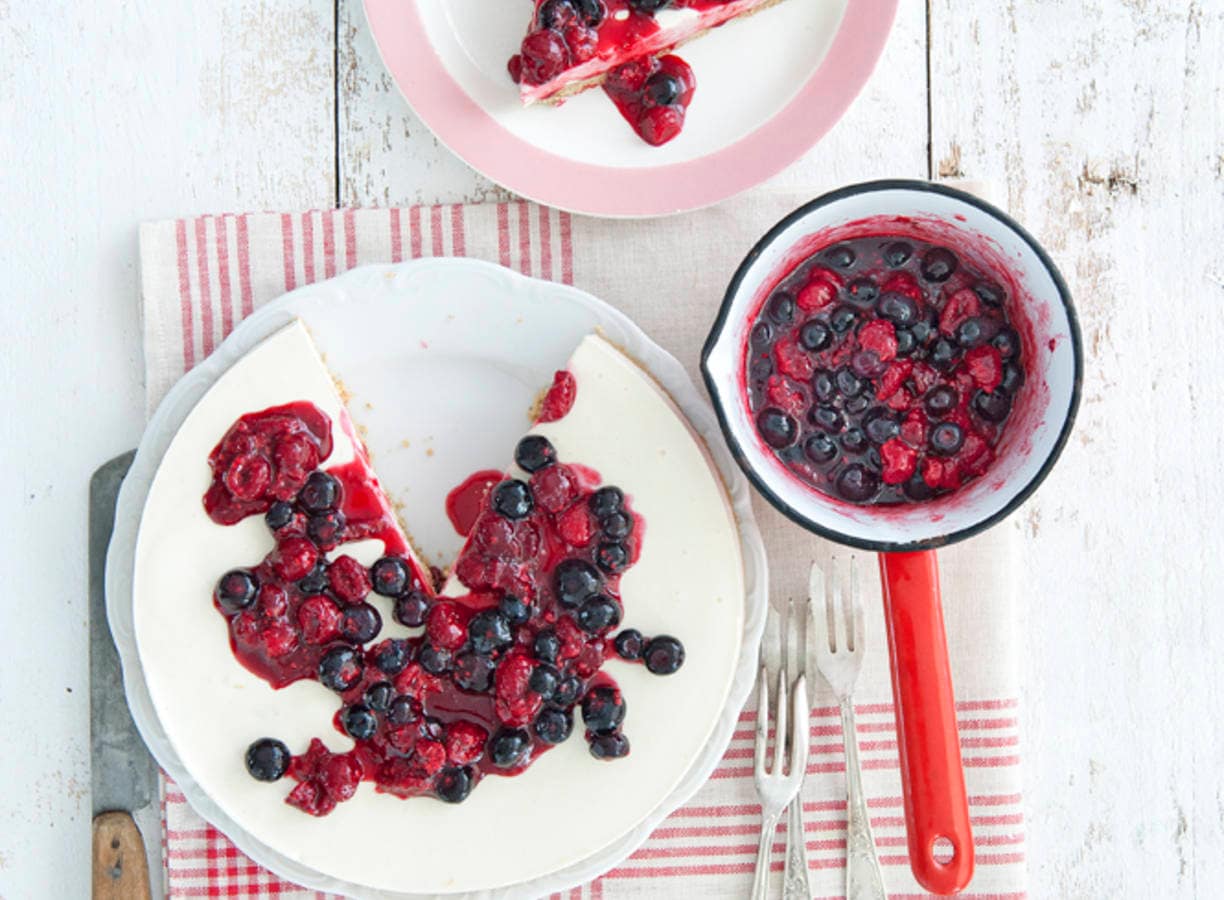 Verwarm in een steelpan het fruit met de suiker 5 min. op laag vuur. Schep regelmatig om. Haal van het vuur en laat helemaal afkoelen. Verdeel vlak voor het serveren over de cheesecake.