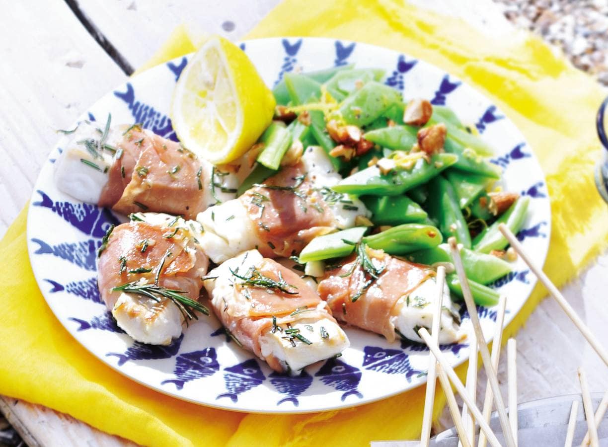 Snijd de kabeljauw met een scherp mes in 12 stukken. Halveer de plakken ham in de lengte en leg op elke 1/2 plak een stuk vis. Ris de naadjes van de rozemarijn. Snijd de rozemarijn in stukjes en strooi over de vis en ham. Wikkel de ham om de vis en zet vast aan de zijkant met een cocktailprikker.