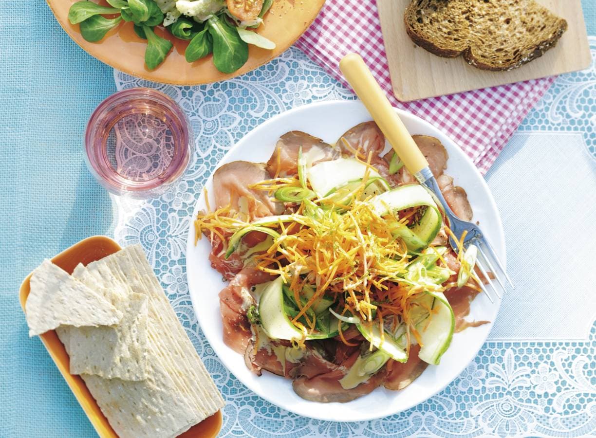 Schil met een dunschiller de komkommer in lange linten en verdeel over de rosbief. Rasp de groene schil van de limoen en pers de vrucht uit. Meng de rasp en het sap met de honing in een kom en schep de peen julienne erdoor.