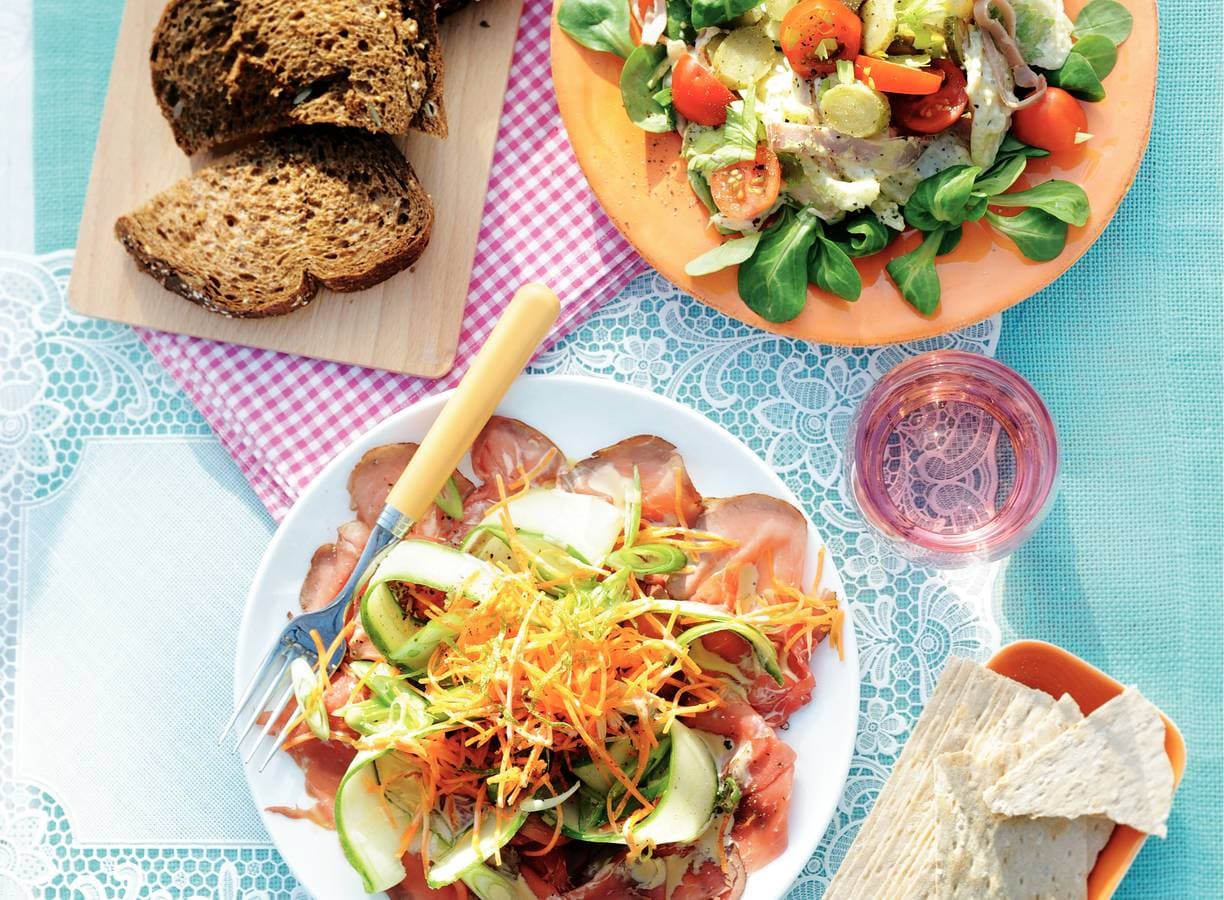 Verdeel de veldsla over 4 borden en schep de aardappelsalade erop. Garneer met de achtergehouden tomaten en augurkjes. Lekker met Pain de Boulogne (brood).