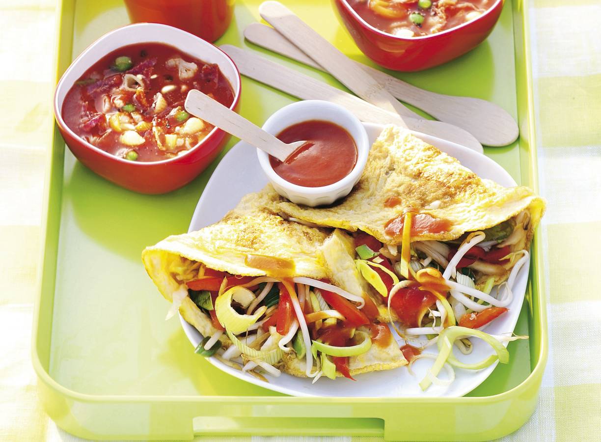 Knapperige groenten in een zakje van ei. Helemaal af met zoete tomatensaus.