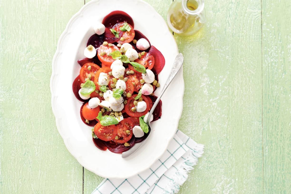 Schil de bietjes en snijd ze in flinterdunne plakjes. Snijd de tomaten in plakjes. Leg de bietjes op een grote platte schaal. Leg de plakjes tomaat erop.