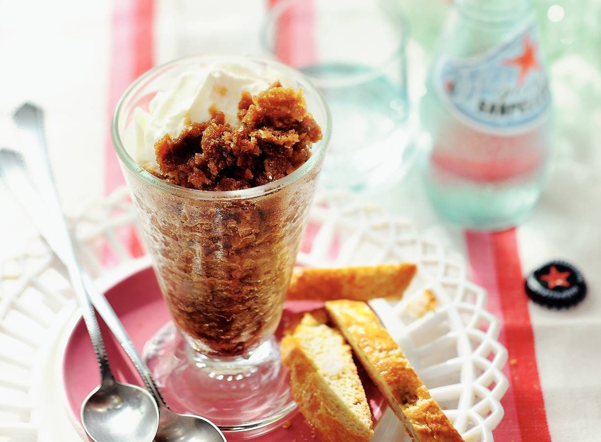 Klop de rest van de slagroom stijf. Verdeel de koffiegranita over 4 glaasjes. Schep de slagroom erop en serveer met de cantuccini.