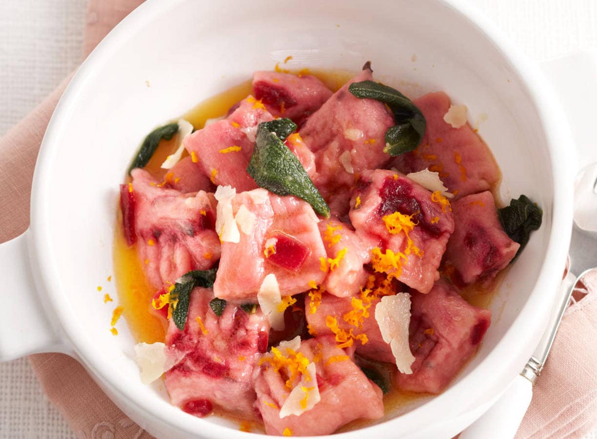 2. Meng de bloem, het zout, de geraspte bietjes, 100 g kaas, de eidooiers en de helft van het eiwit door de aardappelen. Bestuif handen en werkblad met bloem. Schep het aardappelmengsel op het werkblad. Kneed in 2 min. tot samenhangend deeg. Verdeel het deeg in 4 stukken. Rol uit tot rolletjes van 1 1/2 cm dik. Snijd in stukjes van 2 cm. Duw met de tanden van een vork aan 1 kant van de gnocchi een ribbelpatroon.