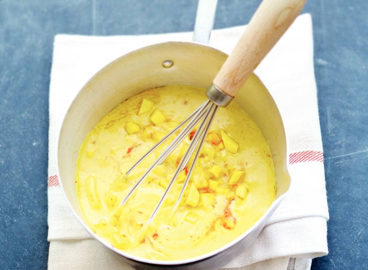 - bewaartipU kunt de kerriesaus met mango 1 dag van tevoren bereiden. Verwarm de saus vlak voor serveren in een steelpan al roerend op laag vuur in 5 min.