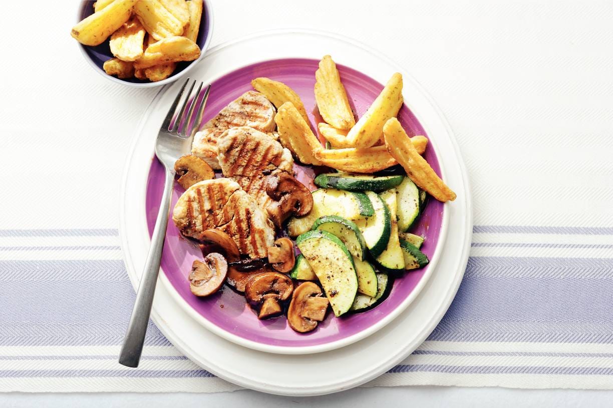 Verhit ondertussen de grillpan. Snijd de varkenshaas in 8 gelijke plakken, bestrijk met de olie en bestrooi met peper en zout. Gril de varkenshaas in 5 min. rosé. Keer halverwege. Leg op elk bord 2 plakken varkenshaas en schep de champignons erop. Serveer met de ribbelpartjes en courgette.
