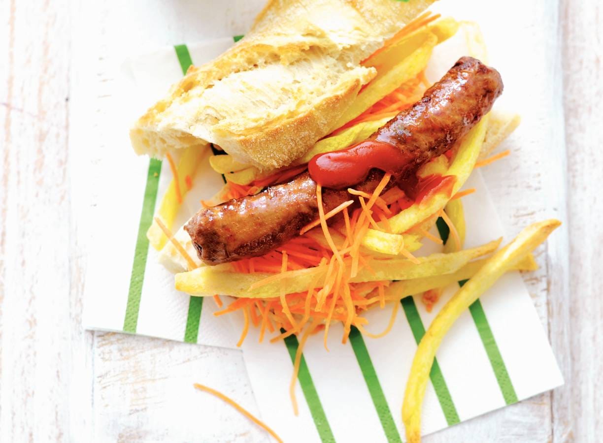 Verdeel het brood in 4 gelijke stukken en snijd ze open. Vul het brood met de peen. Haal de frites en worstjes uit de oven, bestrooi met zout en verdeel met de ketchup over het brood.