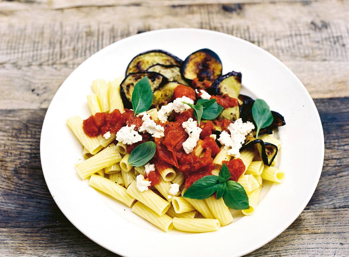 Kook ondertussen de pasta volgens de aanwijzingen op de verpakking beetgaar. Giet af en verdeel over de borden. Verdeel de tomatensaus en aubergines over de pasta. Verkruimel de ricotta erover en bestrooi met het basilicum.