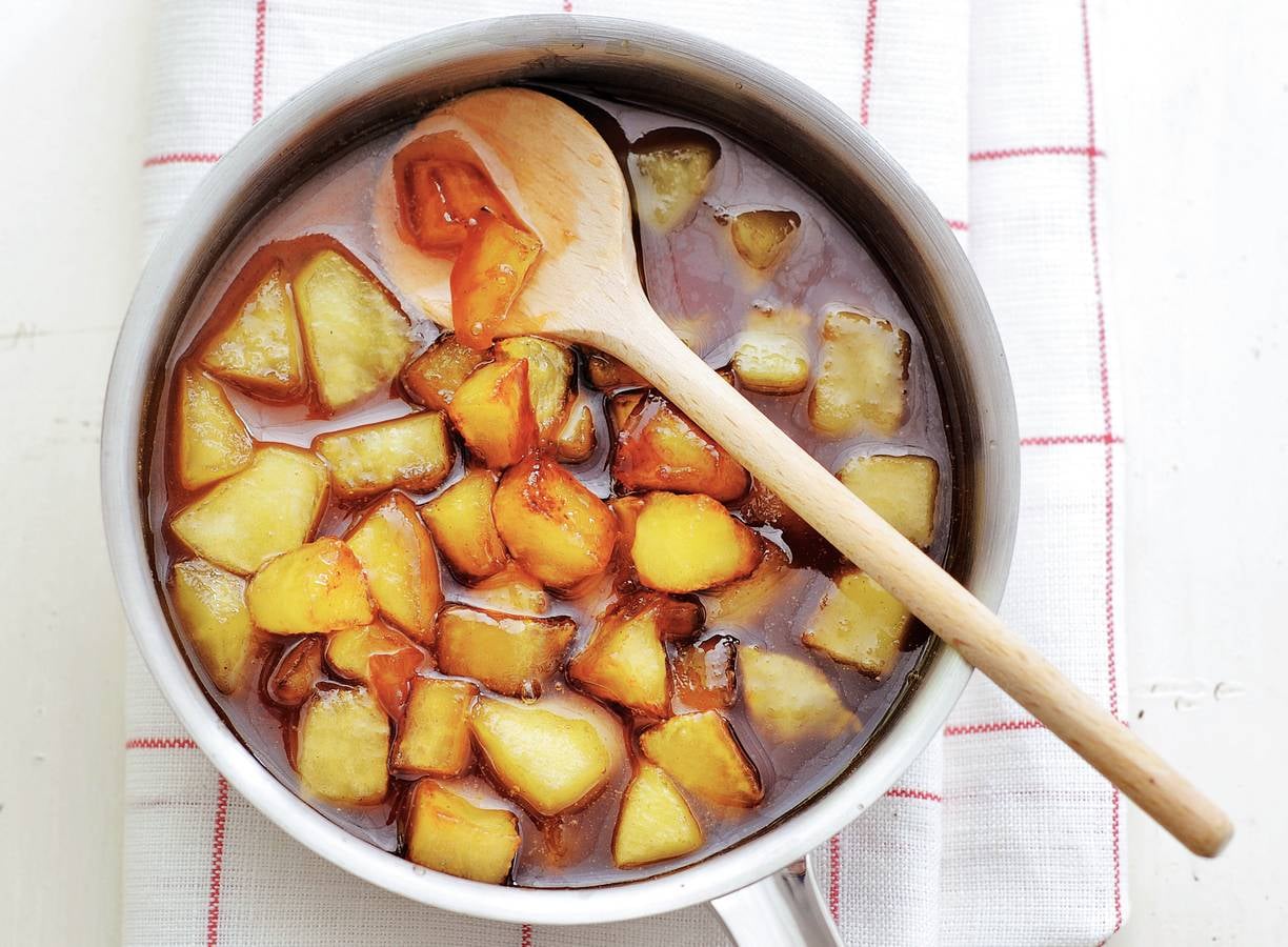 Schil de appel, verwijder het klokhuis en snijd in stukjes. Verhit de boter in een koekenpan en bak de appelstukjes 4 min. op middelhoog vuur. Voeg de suiker en zout toe en bak nog 3-4 min. tot de suiker goudbruin is (gekaramelliseerd).