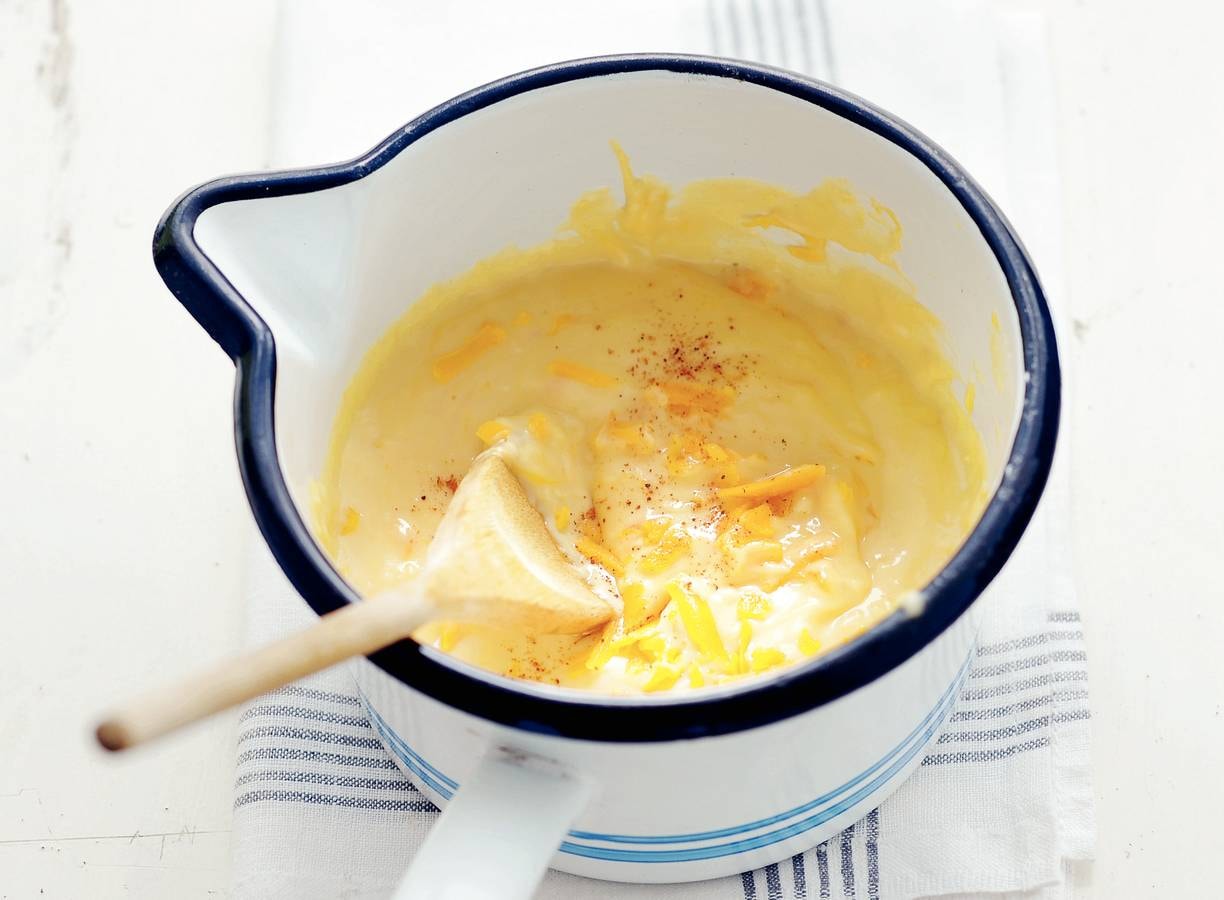 Voeg de melk toe en breng de saus al roerend aan de kook. Laat 3 min. zachtjes koken en voeg dan de kaas toe. Laat de kaas al roerend smelten. Breng op smaak met nootmuskaat, peper en zout. Lekker over groenten zoals bloemkool, broccoli of witlof.