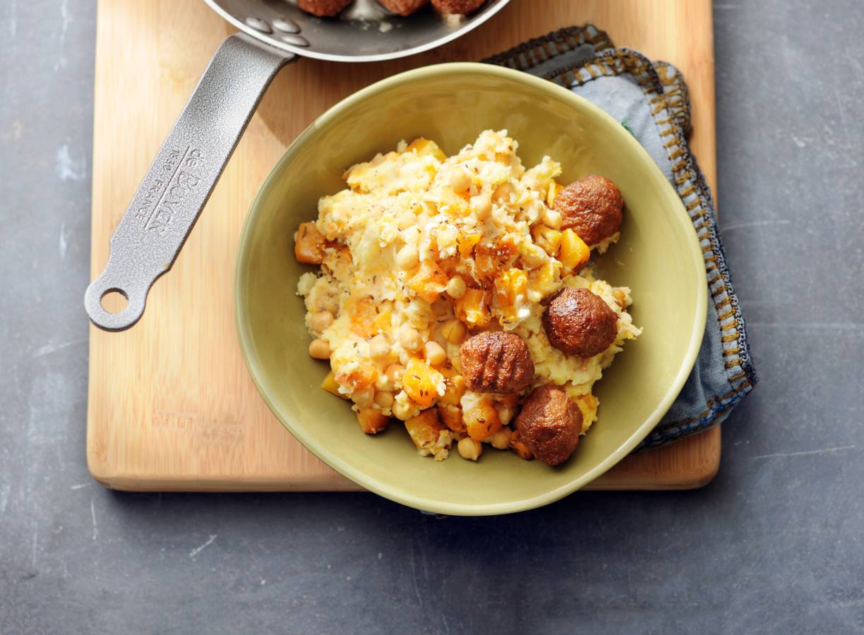 Giet de aardappelen af en stamp ze fijn met de pureestamper. Stamp de helft van de kikkererwten, de helft van de pompoenblokjes en de crème fraîche erdoor. Schep de rest van de pompoen en de kikkererwten erdoor. Breng op smaak met peper en zout. Serveer met de balletjes.