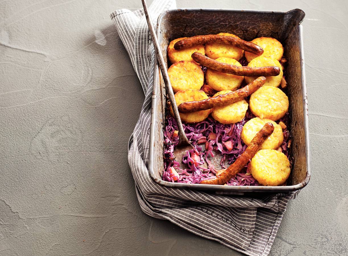 Roer de poedersuiker door de azijn en meng door de kool. Breng op smaak met peper en zout. Verdeel dit mengsel over de schaal. Verdeel de röstirondjes erover en leg de worstjes erop. Zet ca. 40 min. in de oven. Keer de worstjes na 20 min.