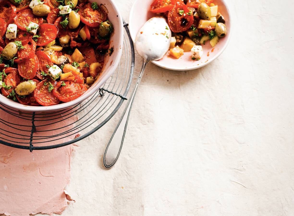 Neem de stoof uit de oven. Meng de olijven en kaas met de peterselie en strooi erover. Lekker met kippenpoten en meergranen stokbrood.