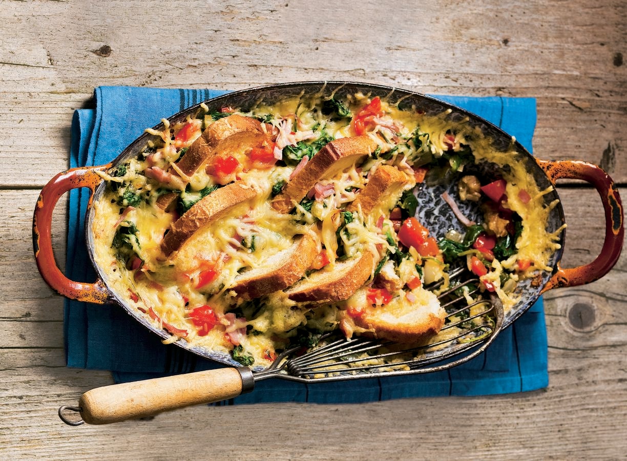 Verwarm de oven voor op 200 ºC. Rooster het brood in de oven in 8 min. krokant. Verhit ondertussen de olie in een koekenpan en fruit de ui 2 min. Bak de paprika 1 min. mee. Voeg de spinazie in 2-3 porties toe en laat slinken. Laat de groenten uitlekken, schep de ham erdoor en breng op smaak met peper en zout.