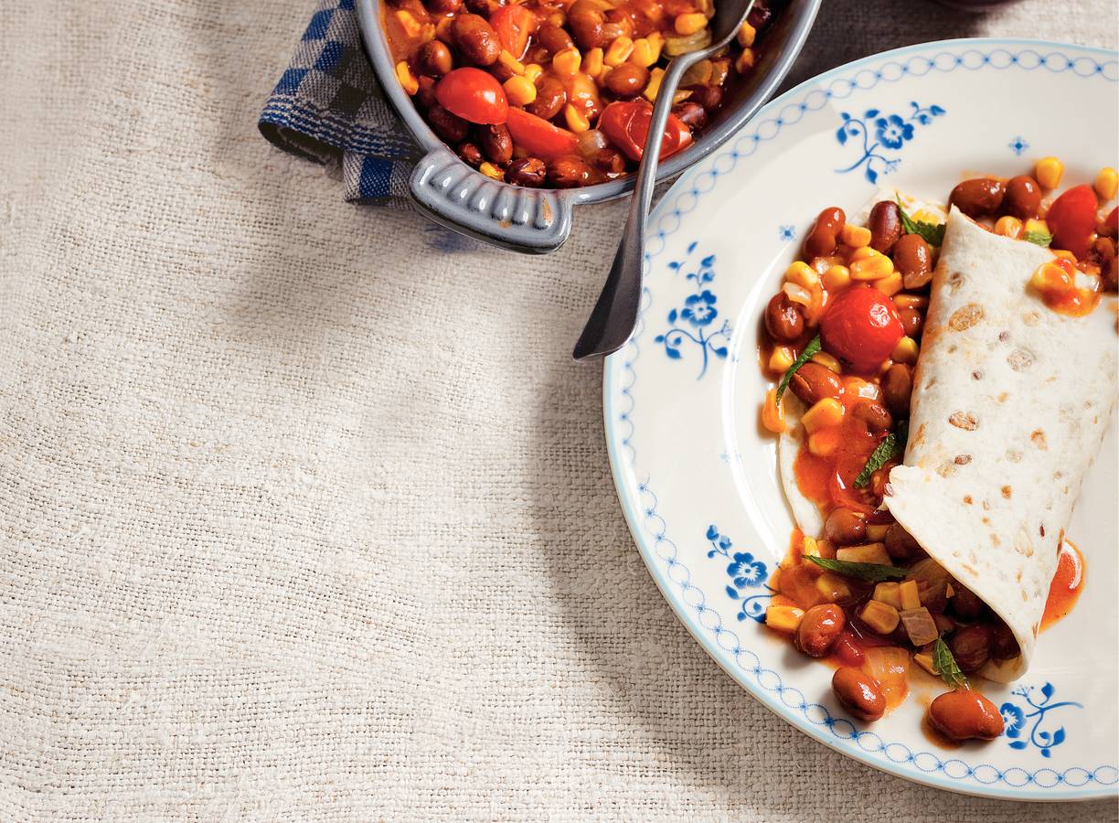 Bak de chili ca. 15 min. in de oven. Verwarm de wraps volgens de aanwijzingen op de verpakking. Haal de chili uit de oven en schep om. Laat iedereen aan tafel zelf de chili op de wraps scheppen.