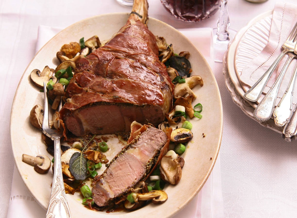Snijd ondertussen de paddenstoelen grof, bosui in ringetjes en de knoflook fijn. Verhit de boter in de pan waarin je het vlees hebt gebakken. Bak de rest van de fijngesneden kruiden 30 sec. Voeg de paddenstoelen, bosui en knoflook toe en bak op middelhoog vuur 6 min. Breng op smaak met peper en zout. Snijd het vlees in plakken van een ½ cm en leg op een schaal of bord. Verdeel de paddenstoelen erover.