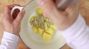 - Verwarm de oven voor op 175 ºC. Schil de knolselderij en aardappelen en snijd in blokjes van 3 cm. Kook in water met zout in 20 min. gaar. Verwarm de melk in een steelpan. Stamp de knolselderij, aardappelen, melk en boter met de pureestamper tot puree. Breng op smaak met de nootmuskaat, peper en eventueel zout.