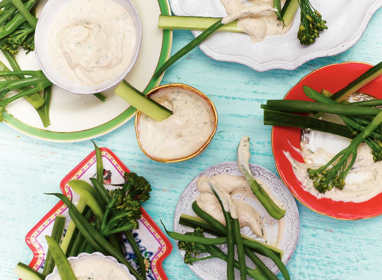 Breng een pan water aan de kook en kook de haricots verts 3 min. Schep met een schuimspaan uit de pan in een bak koud water. Kook de bimi 3 min. in hetzelfde water en schep met een schuimspaan in een andere bak koud water. Verwijder de zaadlijsten uit de komkommer en snijd in staafjes. Verwijder de zaadlijsten van de paprika en snijd het vruchtvlees in reepjes. Laat de haricots verts en bimi apart uitlekken. Leg de groenten op verschillende schaaltjes en serveer met de dips van Jamie*.
