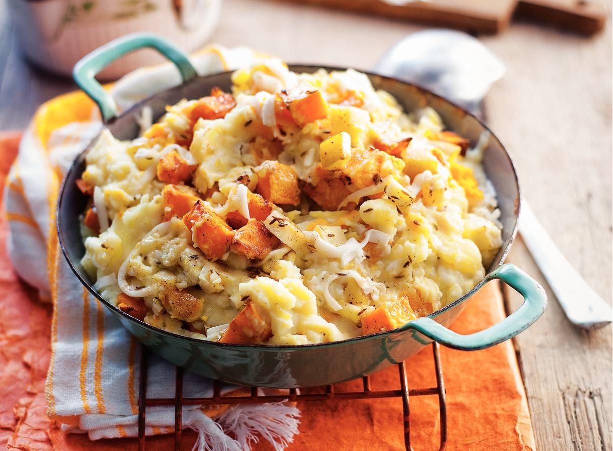 Schil ondertussen de aardappelen en kook ze in water met zout in 20 min. gaar. Stamp fijn met de pureestamper. Verwarm de melk in een steelpan en voeg toe. Meng het pompoen-appelmengsel, de kaneel en kaas erdoor. Breng op smaak met peper en zout. Lekker met falafelballetjes.
