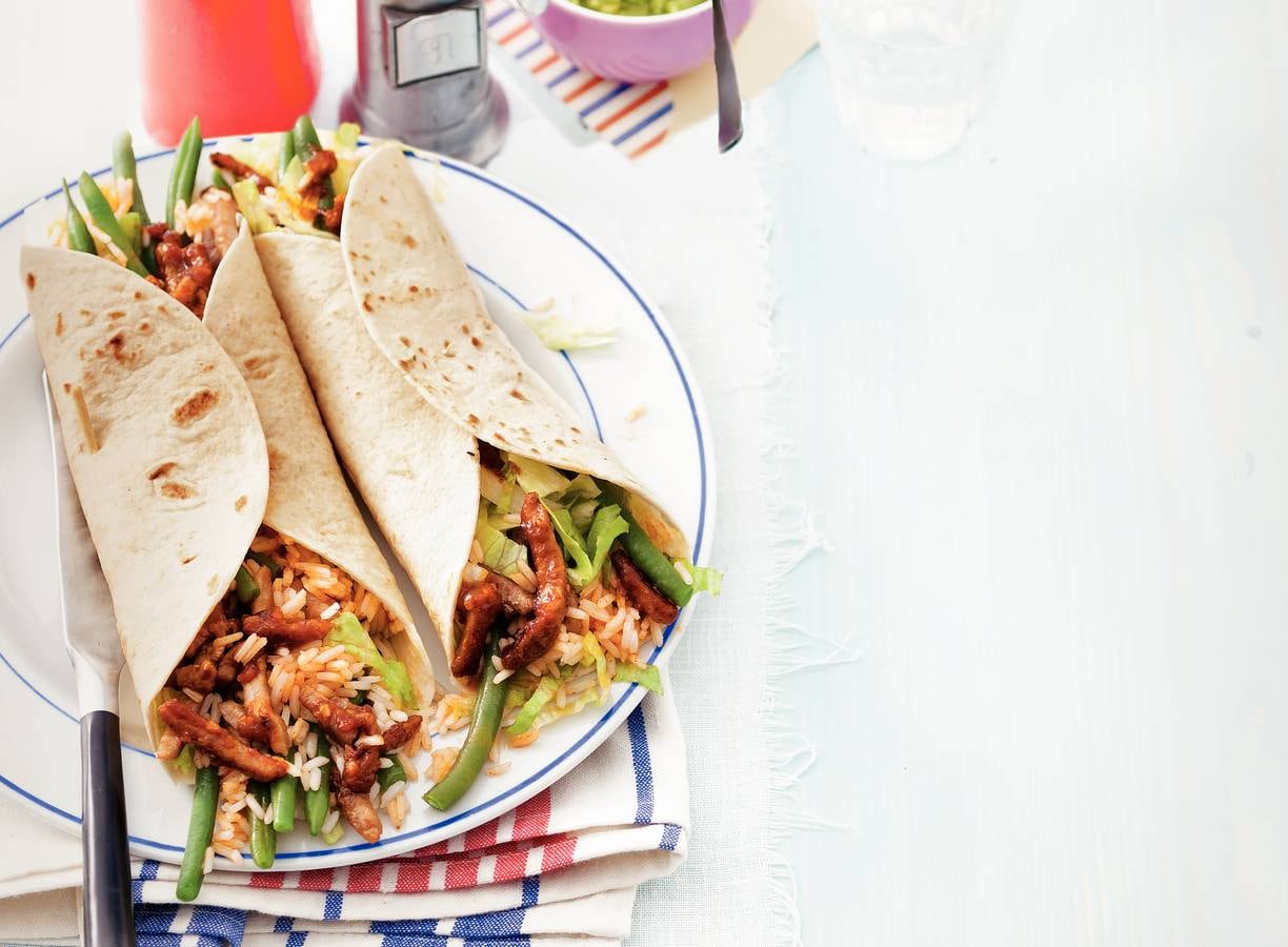 Verdeel de ijsbergsla, sperziebonen, rijst en het vlees over de wraps en rol ze op. Leg op elk bord 2 stuks en serveer.