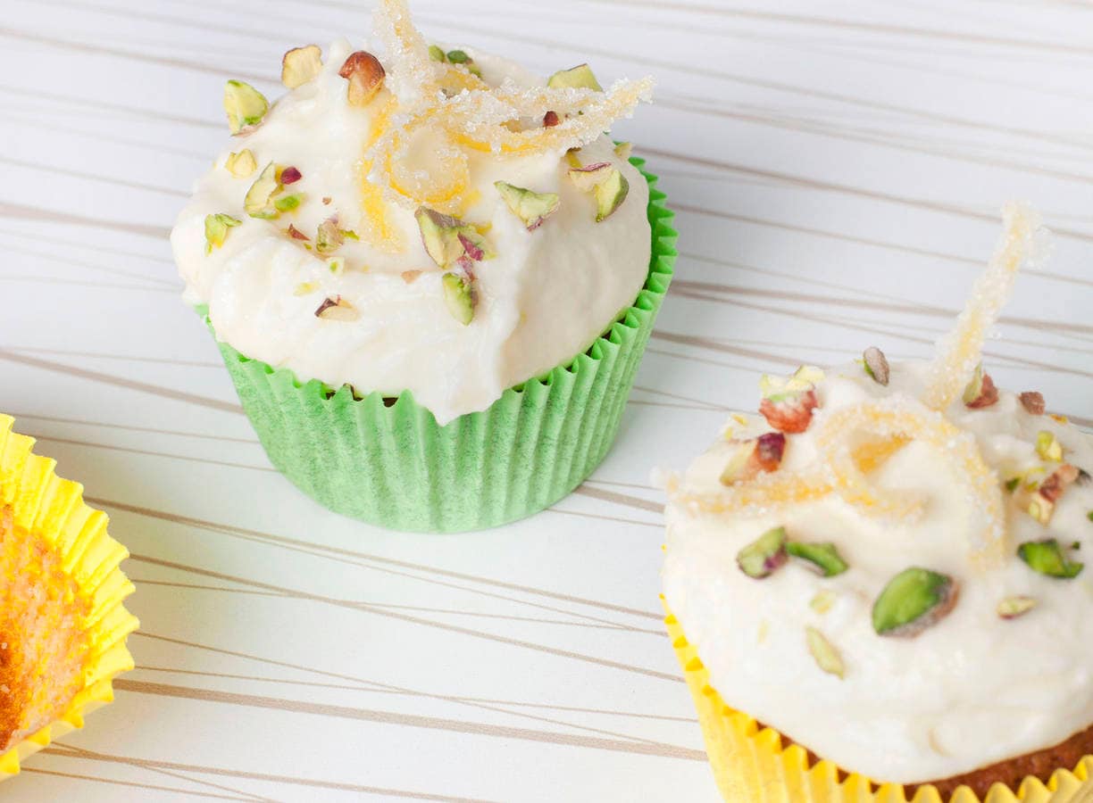 Klop de roomkaas met de rest van de boter, de poedersuiker en 2 el citroensap tot een luchtige massa. Doe het mengsel in de spuitzak. Houd verticaal boven de cupcake en maak een rozet, draai van buiten naar binnen. Bestrooi direct met de rest van de pistachenoten.