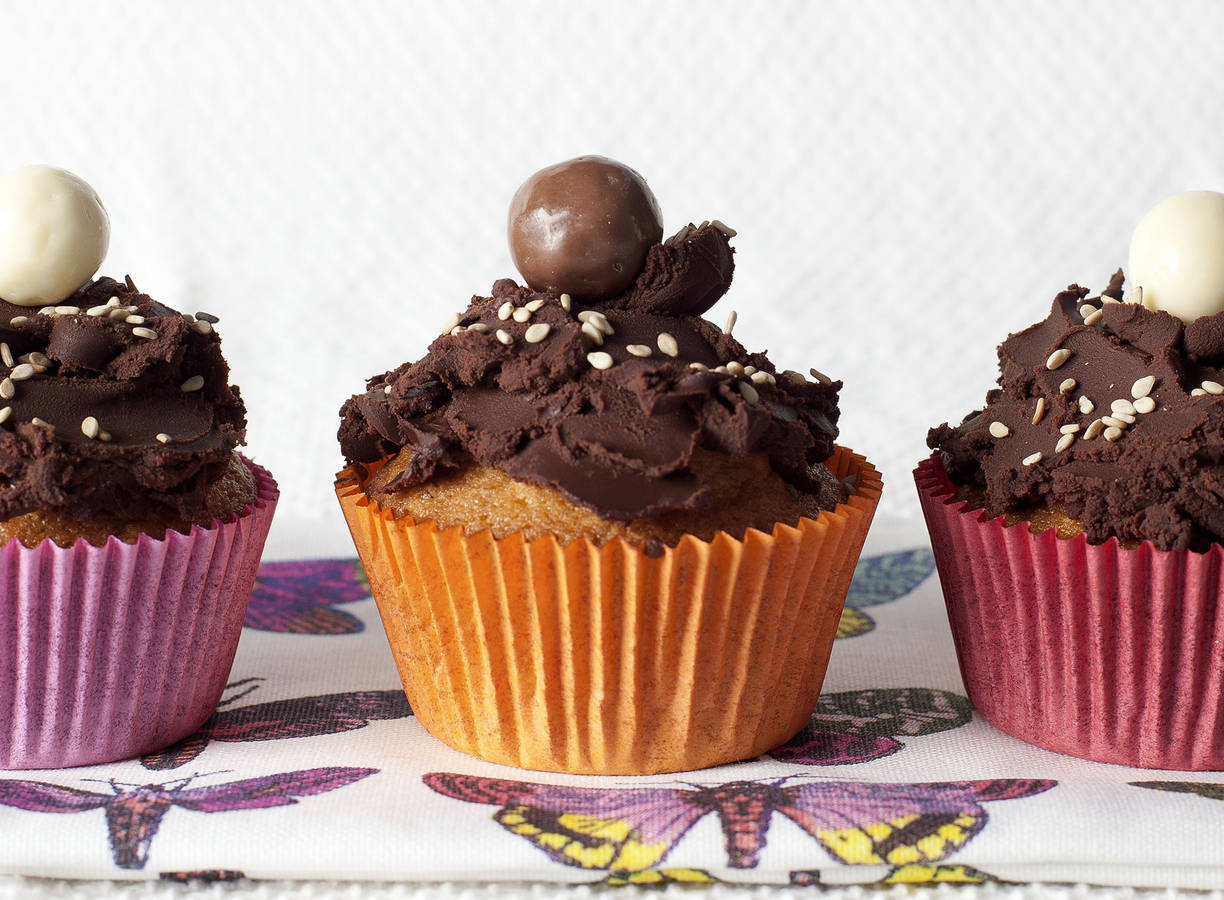Rozijnen-sesamcupcakes met chocoladeganache