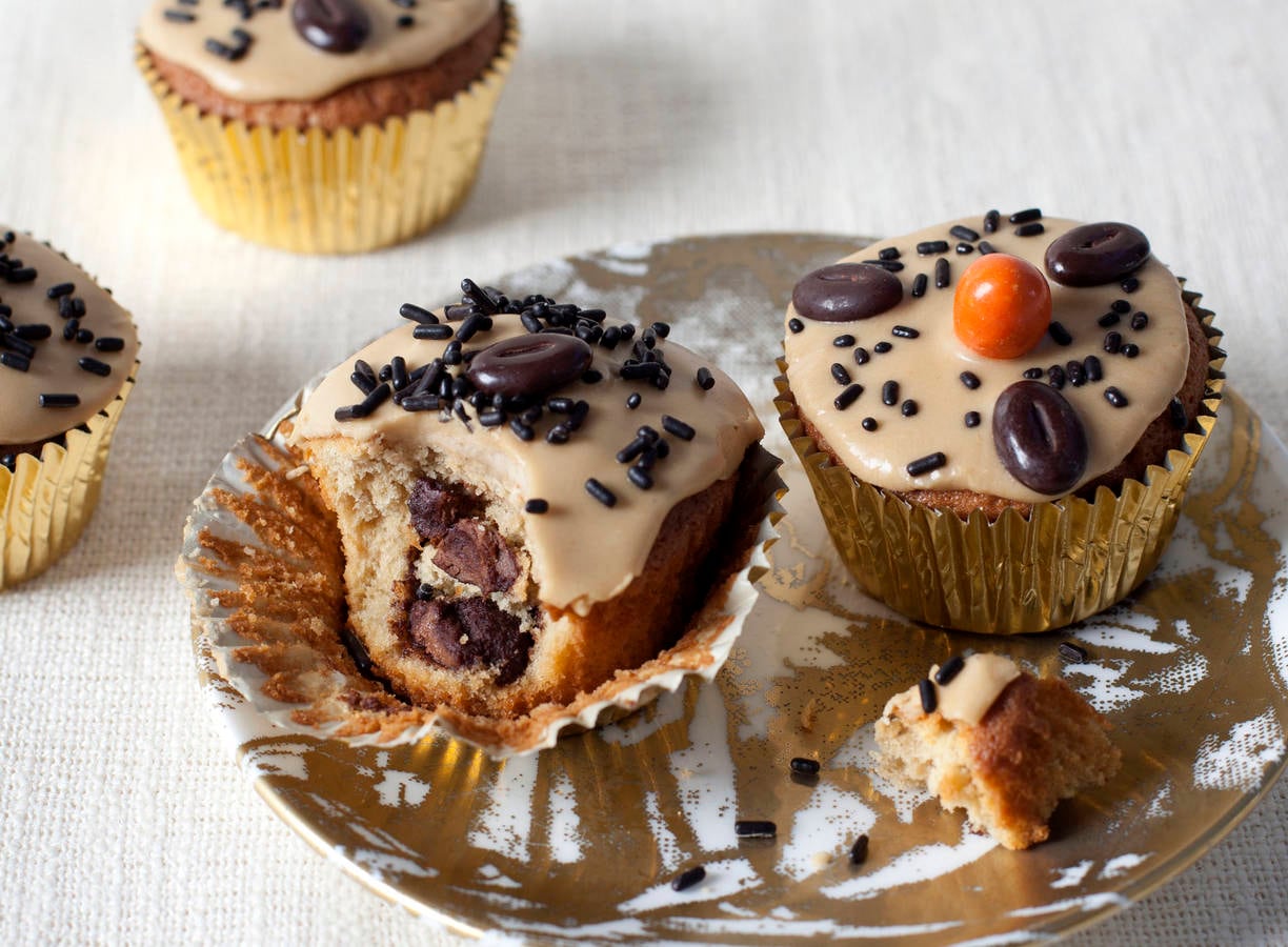 - algemeenGarneer voor een extra feestelijk effect elke cupcake met een chocoladeballetje (bv. M&M Pinda).