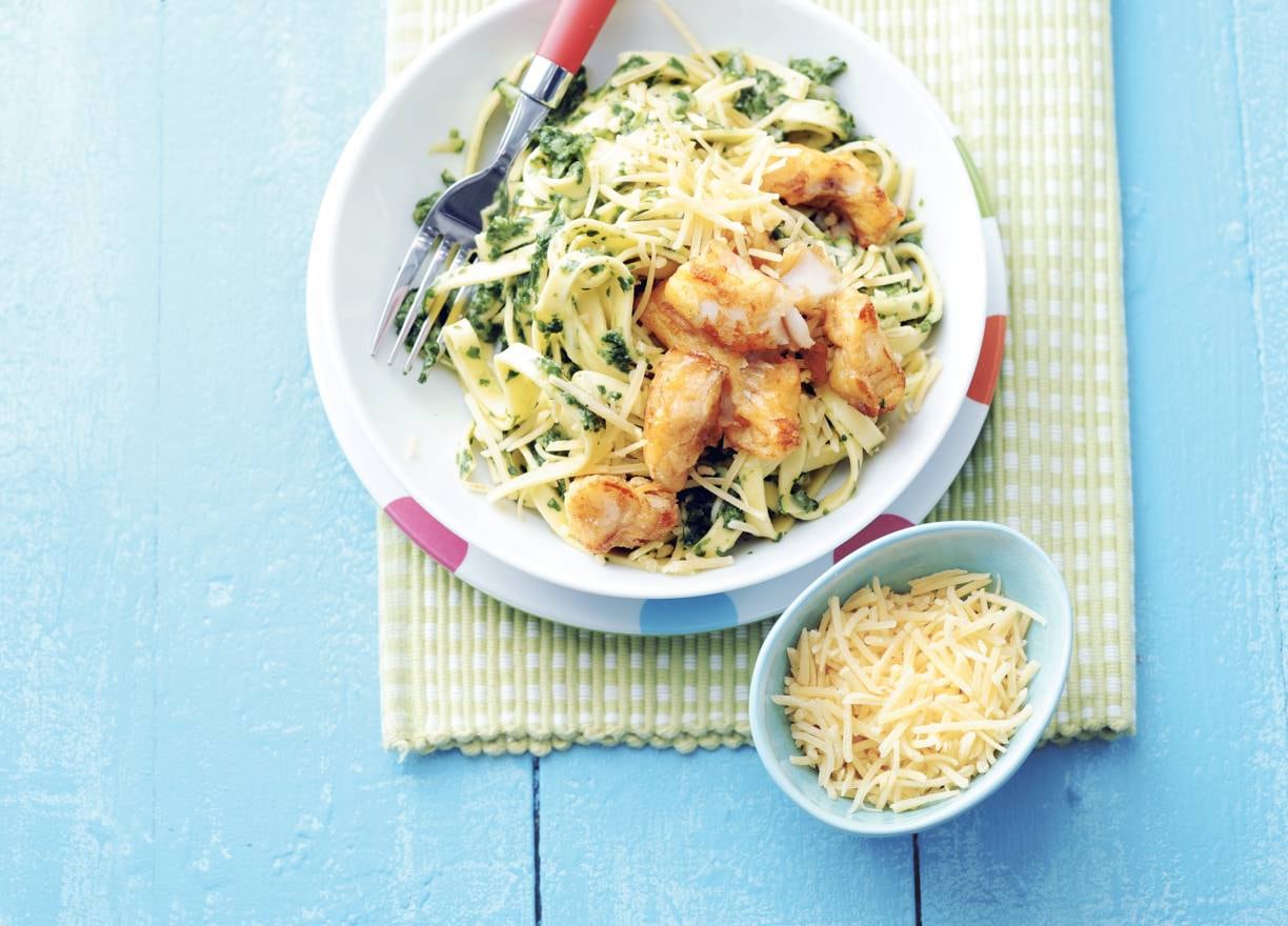 Giet de pasta af en schep door het spinazie¬courgettemengsel. Verdeel over de borden, bestrooi met kaas en verdeel de kibbeling erover.