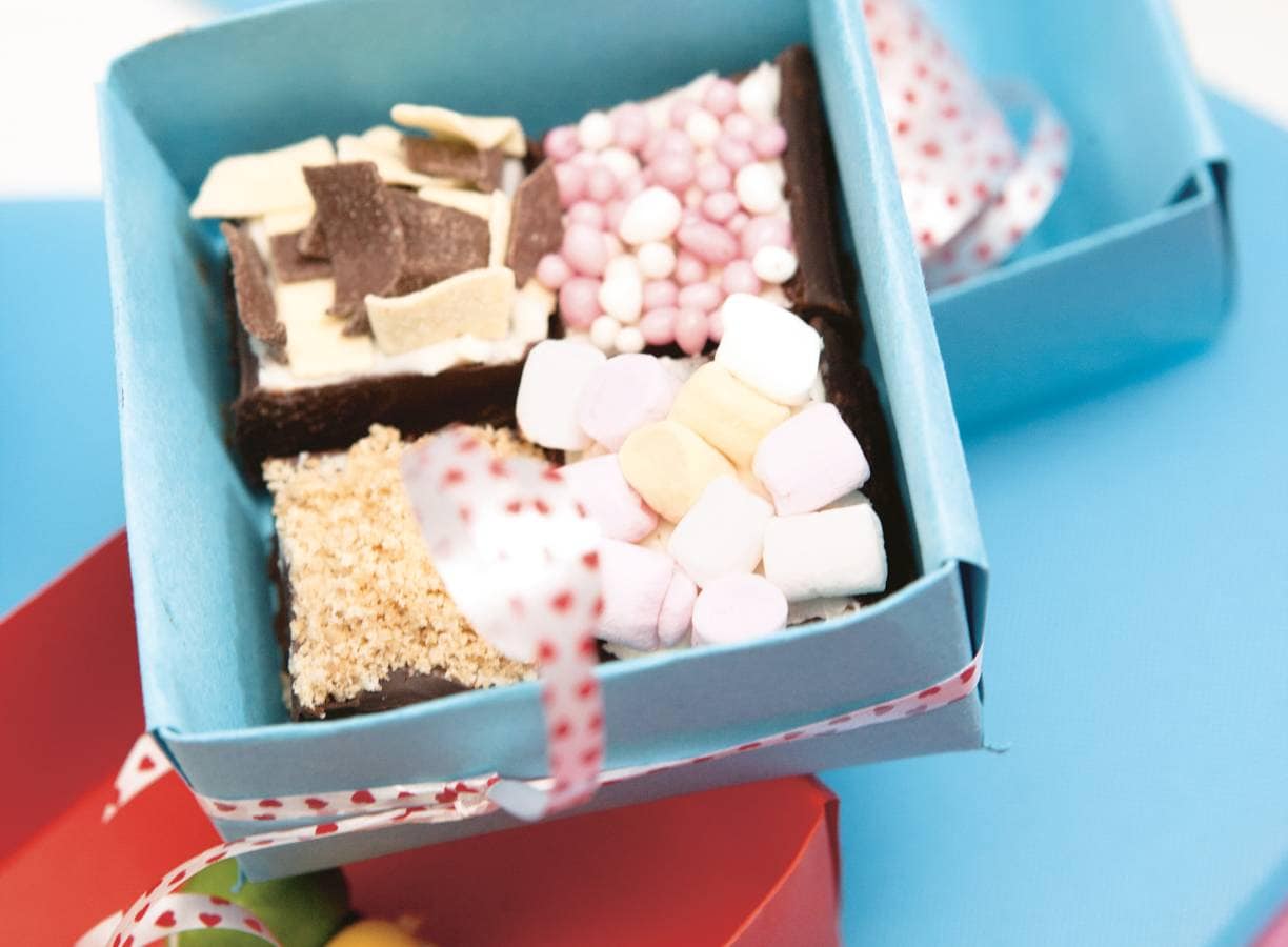 Haal de ganache met behulp van het bakpapier uit de vorm en snijd in 49 blokjes van 3 x 3 cm (7 repen horizontaal en 7 repen verticaal). Bestrijk alle blokjes met witte chocoladepasta. Versier met marshmallows, koekjes, muisjes, vlokken en choco's.