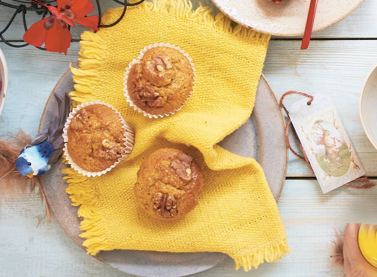 Verdeel gelijkmatig over de 12 vormpjes. Verkruimel de achtergehouden walnoten erover en zet ze 20-25 min. in de oven, of tot ze goed gerezen, goudbruin en gaar zijn. Om te controleren of ze gaar zijn, prikt u erin met de satéprikker. Komt de prikker er schoon uit, dan zijn de muffins gaar. Zet ze anders nog een paar min. in de oven.