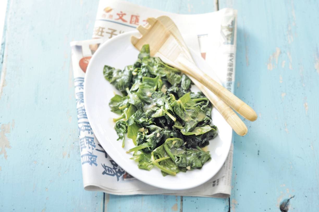 Doe de gembersaus terug in de wok en roer de maizena erdoor. Laat 1 min. zachtjes koken. Schenk de saus over de spinazie en serveer direct. Lekker met babi pangang en nasi.