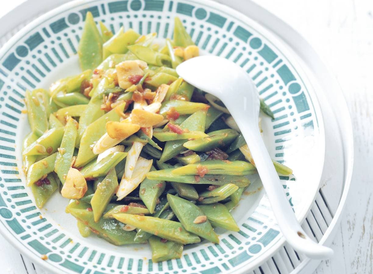 Verhit de olie in een wok en bak de knoflook en sambal 1 min. Voeg de snijbonen toe en bak op hoog vuur 4 min. Voeg de bosui toe, schep om en serveer. Lekker met nasi kuning (gele rijst) en kipsaté.
