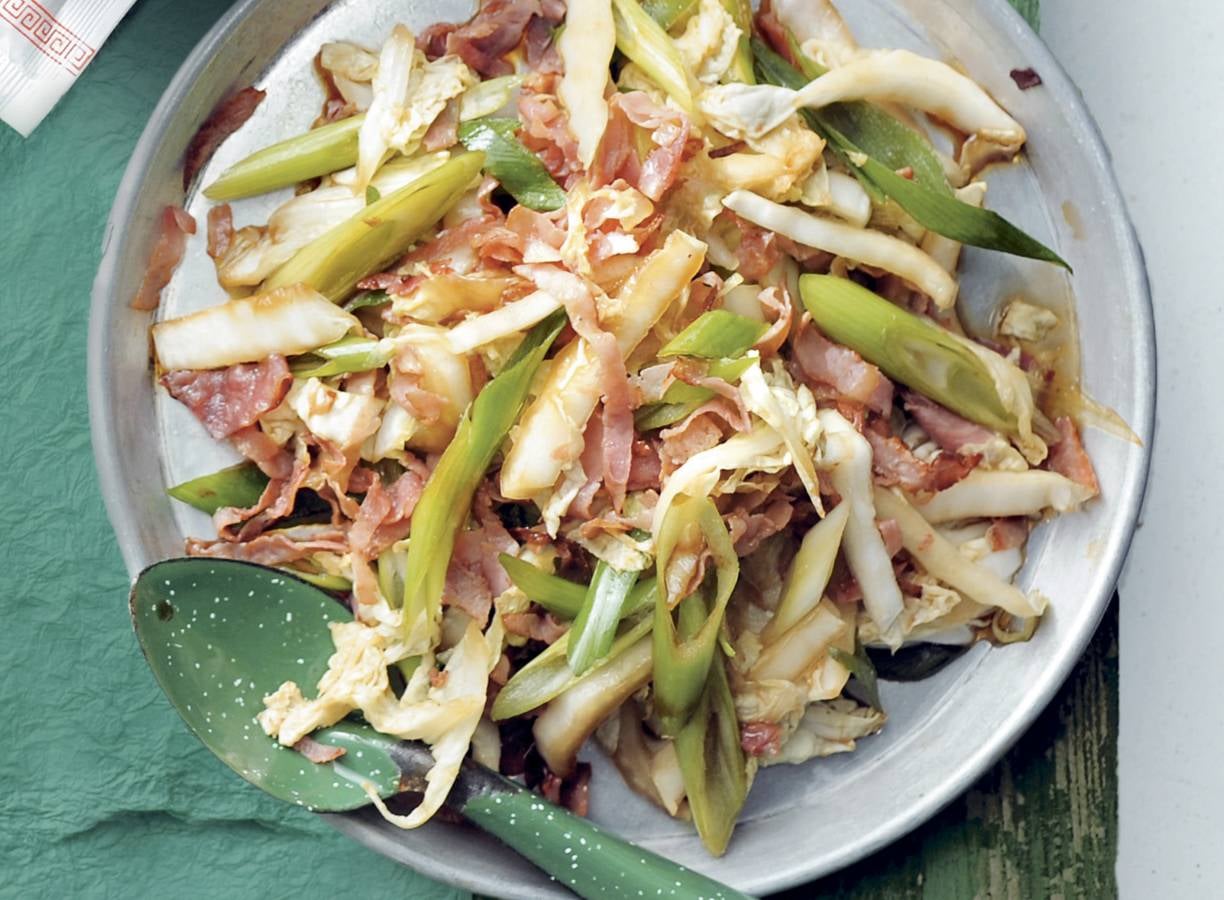 Verhit de rijstolie in een wok en bak de knoflook en beenham 1 min. Voeg de kool met sojasaus toe en bak 4 min. op hoog vuur. Voeg de bosui toe, schep om en serveer direct. Lekker met pittige tofu roerbakreepjes (schaal 180 g, biologisch) en basmatirijst.