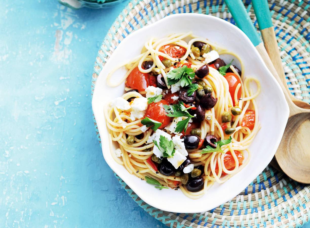 Klassieke Italiaanse spaghetti met het zoete van gebakken romaatjes en het zoute van de olijven en witte kaas.