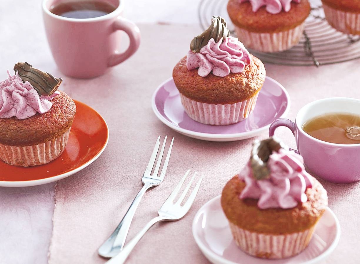 Meng ondertussen de achtergehouden bietenpuree, de poedersuiker en roomkaas. Schep in de spuitzak en spuit kleine torentjes op de muffins. Garneer elke muffin met een paar chocolade chips.