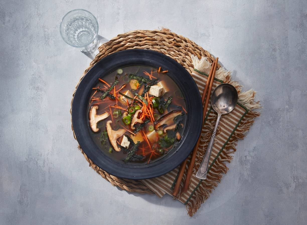 Misosoep: soep op basis van miso. Miso is een pasta van gefermenteerde sojabonen en is al honderden jaren een smaakmaker in Japan. Deze versie is gevuld met groente, het Japanse traditionele recept bestaat uit misopasta, dashi, bosui en zijden tofu.
