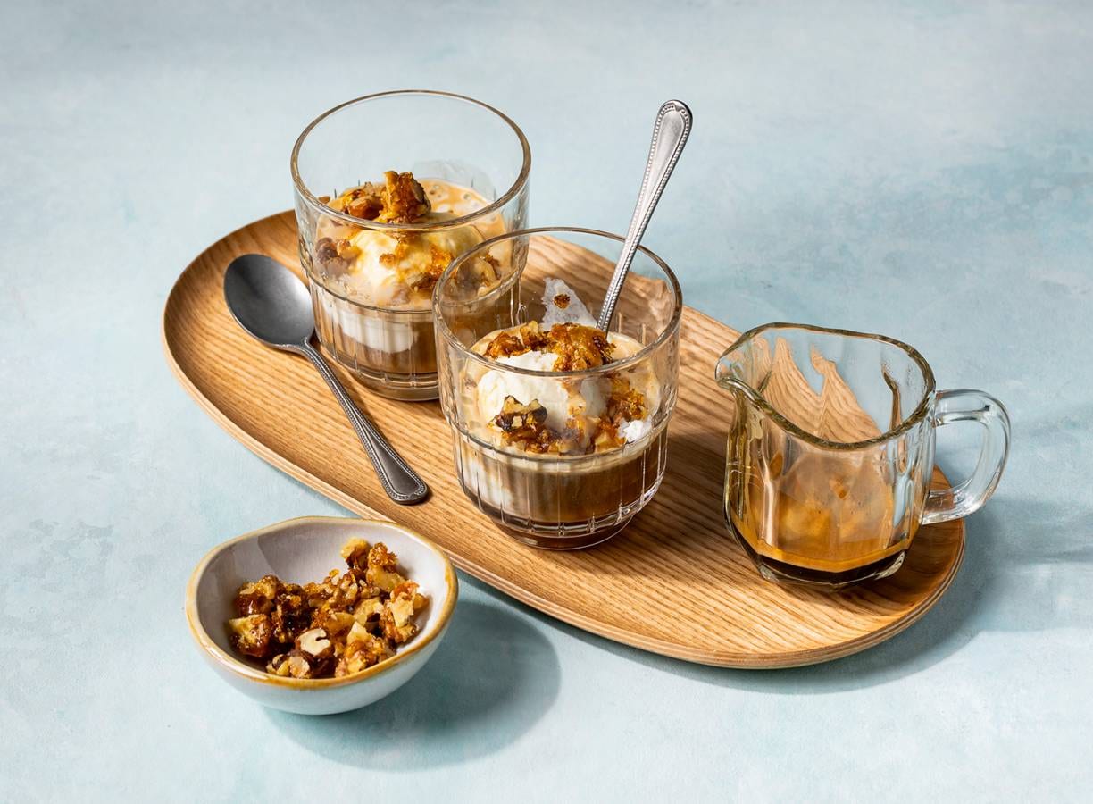 Affogato is Italiaans voor verdronken. Dit recept kom je in Italië tegen op heel veel menukaarten, in deze versie voegen we nog walnoten toe voor een extra bite.